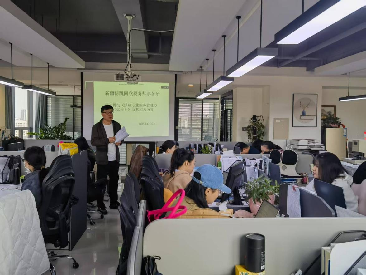 为促进广大税务师提高合规经营意识、坚守依规执业底线,按照中国注册税务师协会《关于学习贯彻《涉税专业服务管理办法(试行)的通知》(中税发〔2025〕6号)精神,2025年4月19日,新疆博凯同欣税务师事务组织全体员工(包括现场员工及外派出差人员)通过腾讯会议全面学习《涉税专业服务管理办法(试行)》,深入剖析涉税专业服务中的法律红线与风险点。