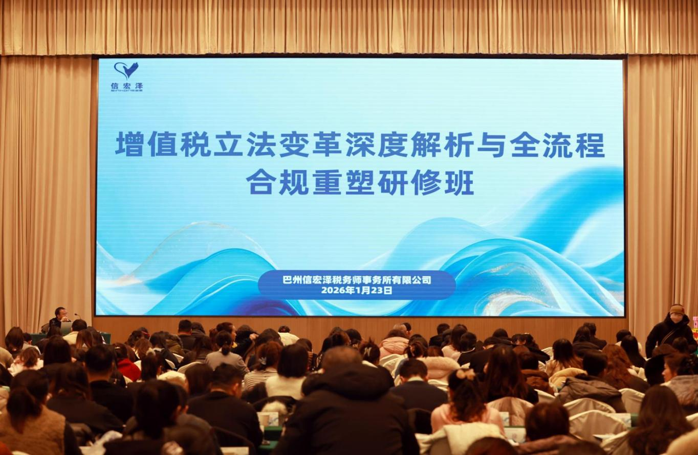 为认真贯彻落实《中华人民共和国新增值税法》及实施条例,促使企业依法管财、合规纳税,2026 年 1 月 23 日,巴州信宏泽税务师事务所有限公司(以下简称 “巴州信宏泽”)举办了“增值税立法变革深度解析与全流程合规重塑研讨班”,共同解码新政要点、破解管财纳税难题,库尔勒市及周边企业400余名财税负责人、财务骨干参加。