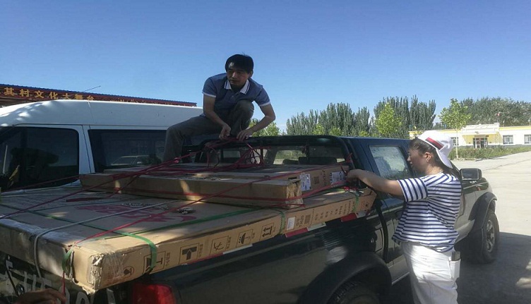 中稅科信税务师事务所工作人员将赠送给驻村工作队的乒乓球案、电视机及移动音箱等物品搬下车。