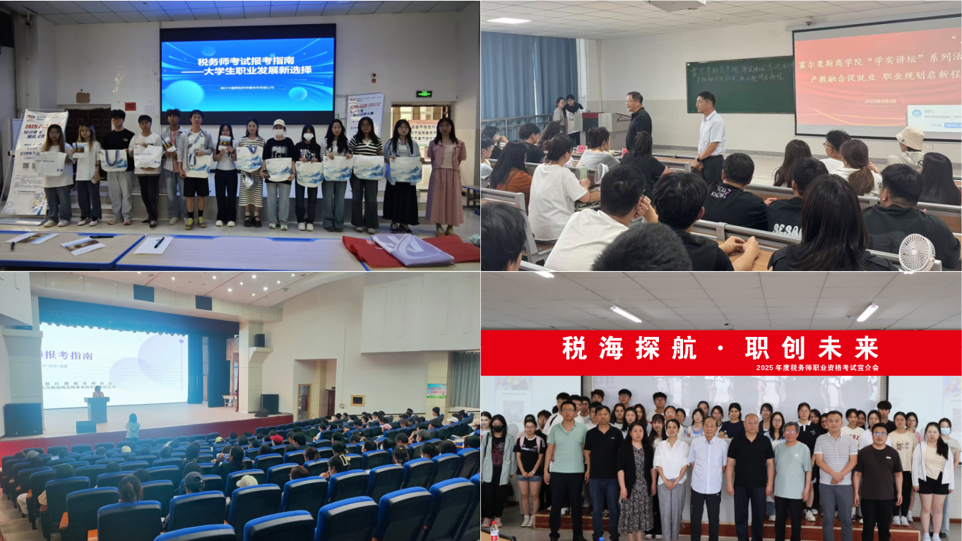 在这之前,5月28日阿克苏勤思税务师事务所有限责任公司在新疆塔里木大学开展了 “2025 年度税务师职业资格考试报考指南辅导”宣传活动,吸引了数百名学生参与其中,为学生们详细解读了报考的各项要点。同日,喀什中鑫辉税务师事务所有限公司在新疆喀什大学举办了“大学发展新选择” 宣传活动,约 200 名学生到场,活动深入探讨了税务师职业为大学生未来发展带来的全新方向与机遇。6 月 4 日,伊犁中翰明昊税务师事务所在伊犁师范大学霍尔果斯商学院开展 “产教融合促就业,职业规划启新程” 宣传活动,100 多名学生积极参与,进一步扩大了税务师职业资格考试在校园内的影响力。