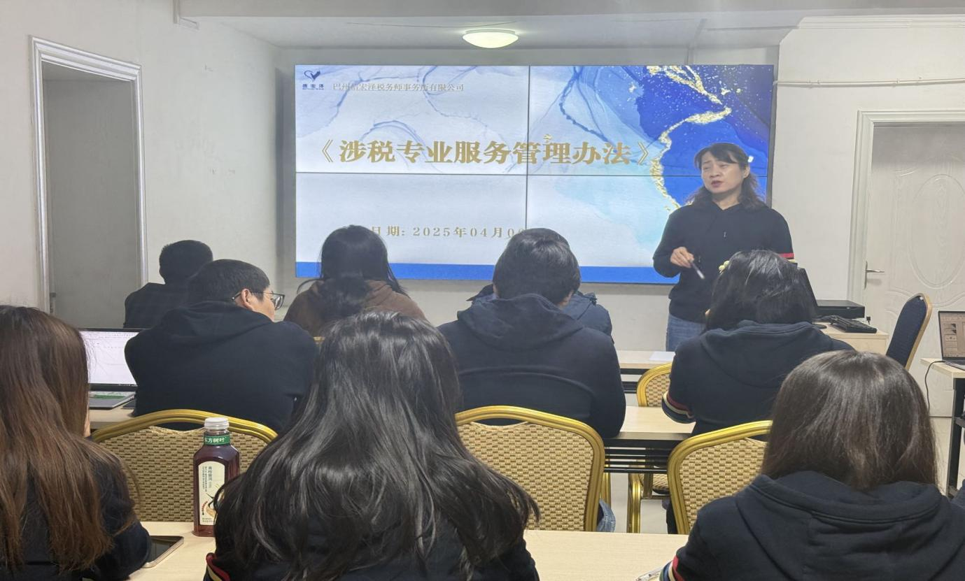 2025年3月17日,《涉税专业服务管理办法(试行)》正式发布,标志着我国涉税专业服务行业迈入规范化、法治化、高质量发展的新阶段。在税务合规经营的道路上,巴州信宏泽税务师事务所有限公司,作为深耕税务服务领域近20年的专业机构,思想高度重视,始终走在依法执业、诚信从业的前列。近日,他们积极响应中税协发【2025】6号“《关于学习贯彻《涉税专业服务管理办法(试行)》”的通知,2025年4月6日组织全体员工深入学习《涉税专业服务管理办法(试行)》,深刻领会政策精神,并以此为契机,进一步强化合规意识、提升服务质效,争做税务合规经营的“拥护者”和“践行者”。