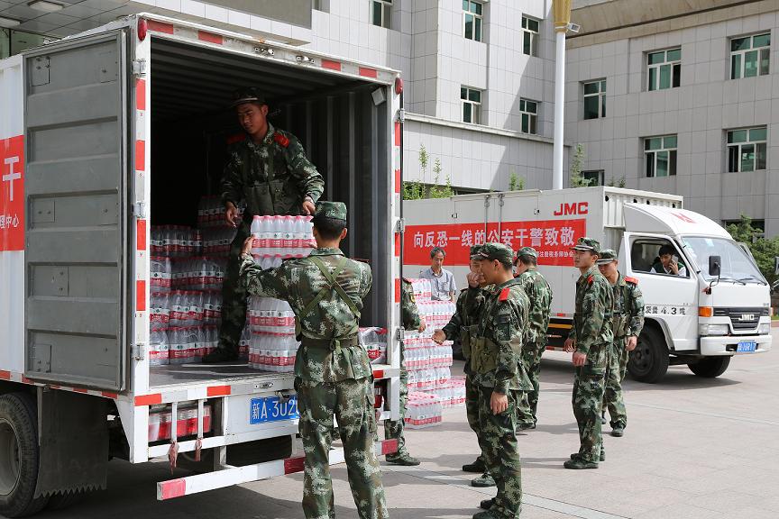 “你们辛苦了!谢谢你们。有你们的保卫,我们才能够安稳的生活、安心的工作,你们为新疆的稳定和发展不惜流血流汗,无私奉献。我们送来这些矿泉水,表达感谢之情。”这些动情的言语,表达着前来慰问人员的敬仰之心。